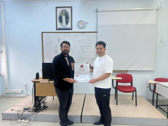 Etkinlik sonunda, katkılarından dolayı Hasret Muharrem Aslan'a teşekkür belgesi Doç. Dr. Ömer Çoban tarafından takdim edildi.